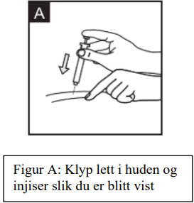 3. Klyp lett i huden. Sett inn kanylen slik du er blitt vist av legen. Slipp huden (se Figur A).