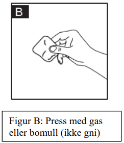 4. Skyv sprøytestempelet sakte helt inn til du er sikker på at all væske er injisert. Trekk kanylen rett ut og trykk forsiktig i noen få sekunder på injeksjonsstedet med gas eller bomullsdott. Ikke gni på området (se Figur B).