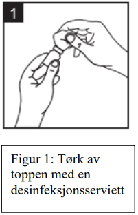 5. Tørk av gummiproppen på hetteglasset med en desinfeksjonsserviett for å hindre at hetteglasset forurenses av bakterier som kan tilføres ved gjentatte kanyleinnstikk (se Figur 1).