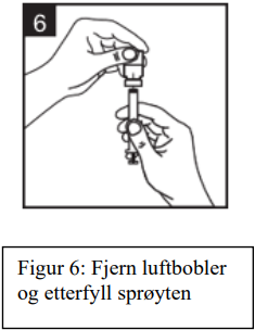 9. Før du trekker kanylen ut av hetteglasset skal sprøyten sjekkes for luftbobler. Hvis det er bobler i sprøyten, hold hetteglasset og sprøyten med kanylen rett opp og bank lett på utsiden av sprøyten inntil boblene flyter opp til toppen. Skyv boblene ut med stempelet og trekk tilbake væske inntil du har den korrekte dosen (se Figur 6).