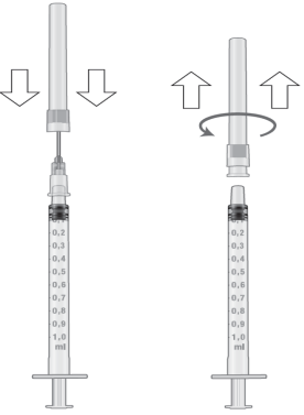 9. Hold sprøyten i øverste delen og hold den korte kanylen i beskyttelseshetten. Fest kanylen til sprøyten. Trykk og skru en halv omgang rundt i én retning inntil den sitter godt fast. Fjern deretter beskyttelseshetten.