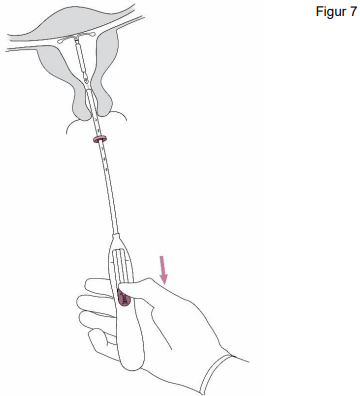 6. Før innføringshylsen forsiktig videre mot fundus i uterus inntil måleringen berører cervix. Jaydess er nå plassert ved fundus.