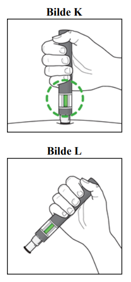 Press pennen fast mot huden for å starte injeksjonen (se bilde J).