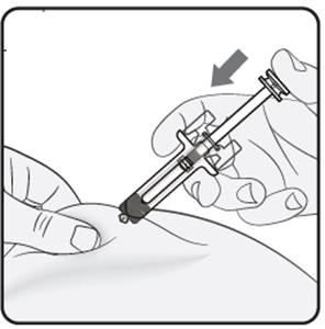 Hold den ferdigfylte sprøyten på injeksjonsstedet og slipp sakte stempelet helt til kanylen dekkes av kanyleskjoldet. Fjern den ferdigfylte sprøyten fra injeksjonsstedet.