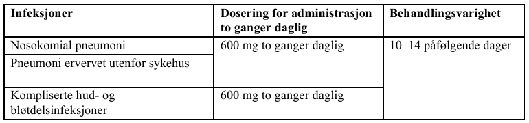 Den anbefalte dosen med linezolid bør administreres intravenøst to ganger daglig.