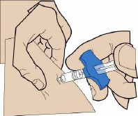 Stikk kanylen helt inn i hudfolden. Skyv stempelet sakte ned og injiser væsken under huden. Hold godt fast i huden til injeksjonen er fullført. Trekk kanylen forsiktig rett ut.