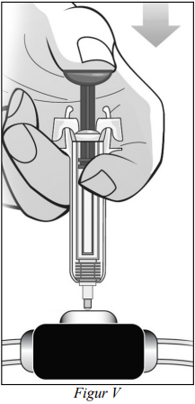 Skyv sprøytestempelet med tommelen mens du holder sprøyten med pekefingeren og langfingeren mot fingergrepene helt til alt av legemidlet er injisert (Figur V).