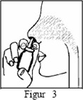 4. Pust forsiktig eller sakte gjennom nesen. Når du puster inn, spray en fin dusj inn i nesen ved å trykke ned EN GANG med fingrene dine (Figur 3).