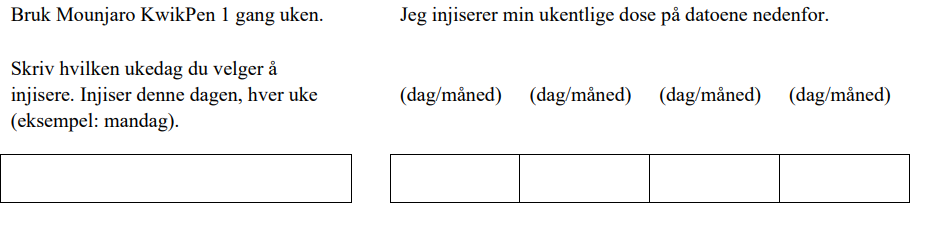 Om nødvendig kan du endre ukedag for den ukentlige injeksjonen med Mounjaro så lenge det har gått minst 3 dager siden forrige injeksjon. Etter å ha valgt en ny ukedag å ta dosen på, skal du fortsette med dosering én gang i uken på den nye ukedagen.