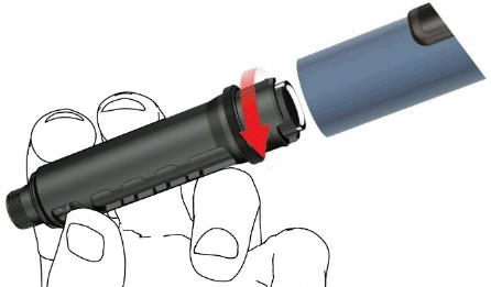D: Skyv gjengestangen forsiktig med fingeren, i en rett linje og så langt som den går. Dette er ikke nødvendig når stangen allerede er i startposisjonen, for eksempel ved første bruk. Den gjengede stangen kan ikke skyves helt tilbake til pennhuset.