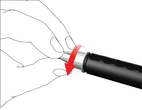 Advarsel: Unngå at kanylen bøyes eller knekkes. Vipp ikke pennen etter at kanylen er ført inn i huden. Vipping av pennen kan føre til at kanylen bøyes eller knekker. Brukne kanyler kan bli sittende fast i huden. Kontakt legen umiddelbart hvis en brukket kanyle sitter fast i huden.