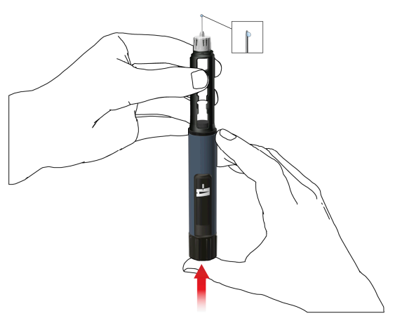 Trykk trykknappen helt inn. Hold den inntrykket til dosesindikasjonen har vendt tilbake til startposisjonen. Noen dråper medisin må utskilles fra kanylespissen.