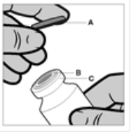 Hetteglasset er kun til engangsbruk. Innholdet i hetteglasset skal injiseres intramuskulært umiddelbart etter at det er trukket opp i sprøyten. Fjern plastikkhetten (A), men ikke metallringen (B) eller proppen (C).