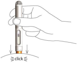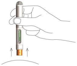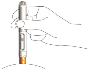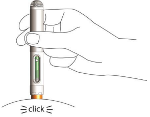 10) Vent i ytterligere 2-3 sekunder før du fjerner pennen fra huden. Sikkerhetsbeskyttelsen på pennen er nå låst for å forhindre nålestikkskader. Du kan nå slippe hudfolden.