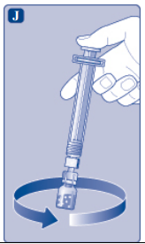 (I) Dersom du trenger mer enn ett hetteglass for at du skal få full dose, gjenta trinn A til J med ytterligere hetteglass, hetteglassadaptere og ferdigfylte sprøyter inntil du har oppnådd din nødvendige dose. |
