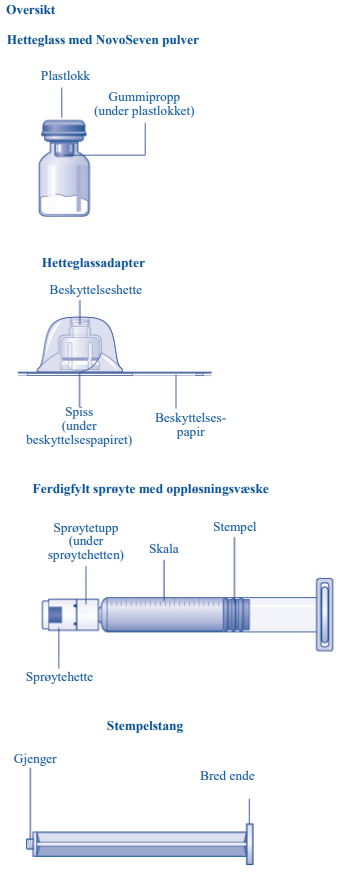 Du trenger også et administrasjonssett (slange og butterfly-kanyle, sterile alkoholservietter, gasbind og plaster). Dette utstyret er ikke inkludert i pakningen til NovoSeven.