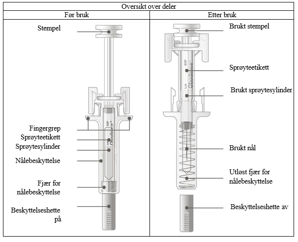 Hver pakning inneholder ferdigfylt sprøyte med nålebeskyttelse.