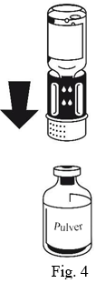 4. Sett hetteglasset med pulver på et flatt underlag og hold det fast. Snu hetteglasset med oppløsningsvæske og med overføringssettet opp-ned. Sett den hvite delen på toppen av hetteglasset med pulver og trykk bestemt ned til det knepper på plass (Figur 4). Ikke vri når den festes. Oppløsningsvæsken strømmer automatisk ned i hetteglasset med pulver.