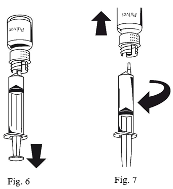 Oppløsningen skal være klar eller svakt opaliserende. Så snart oppløsningen er overført, hold stempelet på sprøyten fast (slik at det peker nedover) og fjern sprøyten fra overføringssettet (Figur 7). Kast det tomme hetteglasset sammen med den hvite delen av overføringssettet.