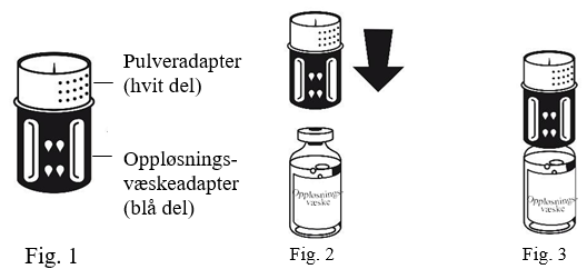 Overføringssettet er vist i figur 1. Sett hetteglasset med oppløsningsvæske på et flatt underlag, og hold det fast. Snu overføringssettet opp-ned. Plasser den blå delen av overføringssettet over hetteglasset med oppløsningsvæske og press bestemt ned til den knepper på plass (Figur 2 og 3). Ikke vri når den festes.