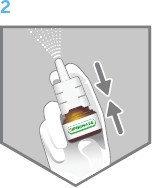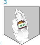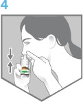 Hold flasken som vist (Bilde 3). Før dysen inn i det ene neseboret og lukk det andre neseboret, bøy hodet litt framover og hold flasken loddrett som vist (Bilde 4). Sikt litt bort fra midten av nesen.