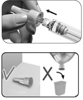 Hvis den avtrekkbare forseglingen er skadet eller løs, må du ikke bruke kanylen. Kast den i en beholder for skarpt avfall. Spør lege eller apotek om hvordan du kan få en ny kanyle.