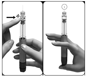 Trykk doseinnstillingsknappen ned så langt det går. En liten væskedråpe vil komme ut av kanylespissen. Dette viser at den ferdigfylte pennen er klar til injeksjon.