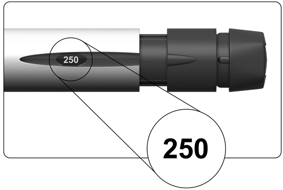 5.3. Kontroller på nytt at tallet som vises i doseringsvinduet er ”250”. Dersom dette ikke er tilfellet, må du justere den (se punkt “4. Innstilling av dosen til 250”).