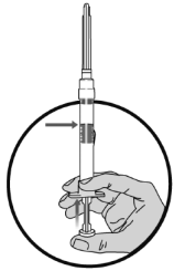 2. Slik blander du væsken med pulveret: Hold sprøyten RETT OPP (loddrett, med spissen opp), og press stemplet LANGSOMT (bruk ca. 5-10 sekunder) oppover, helt til proppen er ved den blå streken midt på sylinderen.
