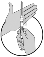 3. Hold sprøyten RETT OPP og rist sprøyten forsiktig for å blande partiklene godt til en ensartet suspensjon. Suspensjonen vil se melkeaktig ut.