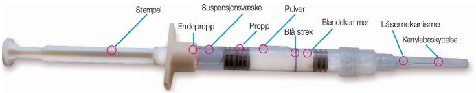 Ferdigfylt injeksjonssprøyte med to kammer - pulver og væske i hvert sitt kammer.