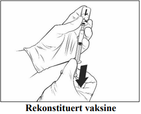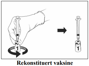 Instruksjoner for rekonstituering av vaksinen med oppløsningsvæske presentert i ferdigfylt sprøyte: