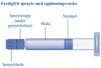Advarsel: Den ferdigfylte sprøyten er laget av glass og er utformet til å passe sammen med standard koblinger med luer-lås. Noen nålefrie koblinger som har en innvendig spiss passer ikke sammen med den ferdigfylte sprøyten. Denne uforlikeligheten kan hindre administrering av legemidlet og/eller føre til at den nålefrie koblingen skades.