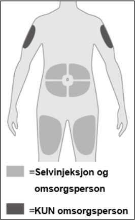 Merk: Bytt injeksjonsstedet hver gang du setter en injeksjon. Hvert nytt injeksjonssted skal ha minst 3 cm avstand fra forrige injeksjonssted.