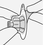 Trekk blisterposen opp halvveis, og bruk den til å ta tak i basen på nålen som vist. Mens du holder i den hvite kragen, festes sprøyten til nålens luerkobling med en bestemt vridende bevegelse med klokken til den sitter godt. Ikke ta på nålens lueråpning. Det vil føre til kontaminering.