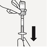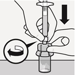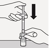 Overfør suspensjonen til sprøyte Snu hetteglasset fullstendig. Trekk stempelstangen langsomt ned for å trekke hele innholdet fra hetteglasset inn i sprøyten. |