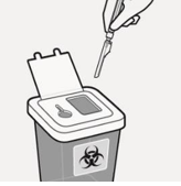 Kast nålene på riktig måte Kontroller for å bekrefte at sikkerhets-anordningen for nålen er helt aktivert. Kast i en godkjent beholder for skarpe gjenstander. Kast også den ubrukte nålen som følger med i dosepakningen. |