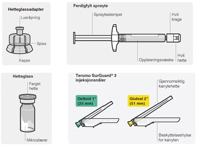 Resuspender mikrosfærer Ta helt ut av blisterposen. Rist sprøyten kraftig igjen rett før injeksjon ettersom noe bunnfelling kan ha forekommet. |