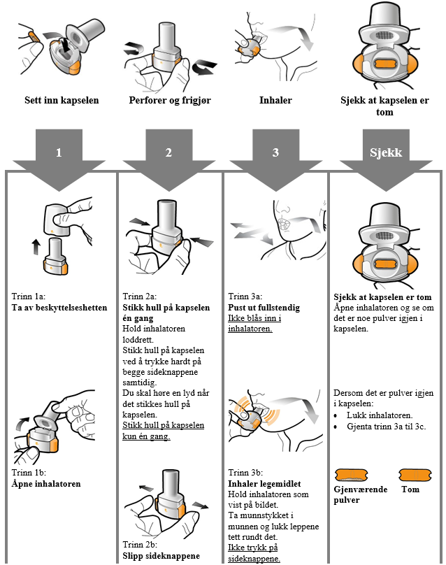 Les instruksjonen i slutten av dette pakningsvedlegget for mer informasjon om hvordan inhalatoren brukes.