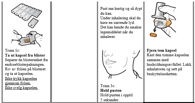Inhalatoren i hver pakning skal kastes etter at alle kapslene i pakningen har blitt brukt.