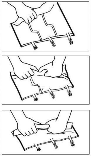 Rull posen stramt sammen fra siden med håndtak mot portene, først med høyre hånd og så ved bruk av et vedvarende trykk med venstre hånd, inntil de vertikale forseglingene brytes. De vertikale forseglingene brytes ved hjelp av væsketrykket. Forseglingene kan også åpnes før ytterposen er fjernet.