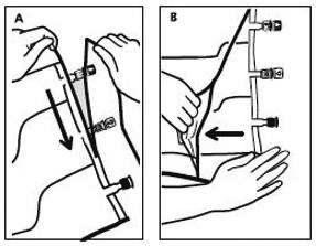 For å fjerne ytterposen, hold posen horisontalt og åpne ved å ta tak i et hjørne og dra langs bruddanvisningen i posens øvre kant (Bilde A).