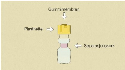 Glass type 1, med plugg og propp av butylgummi og plasthette.