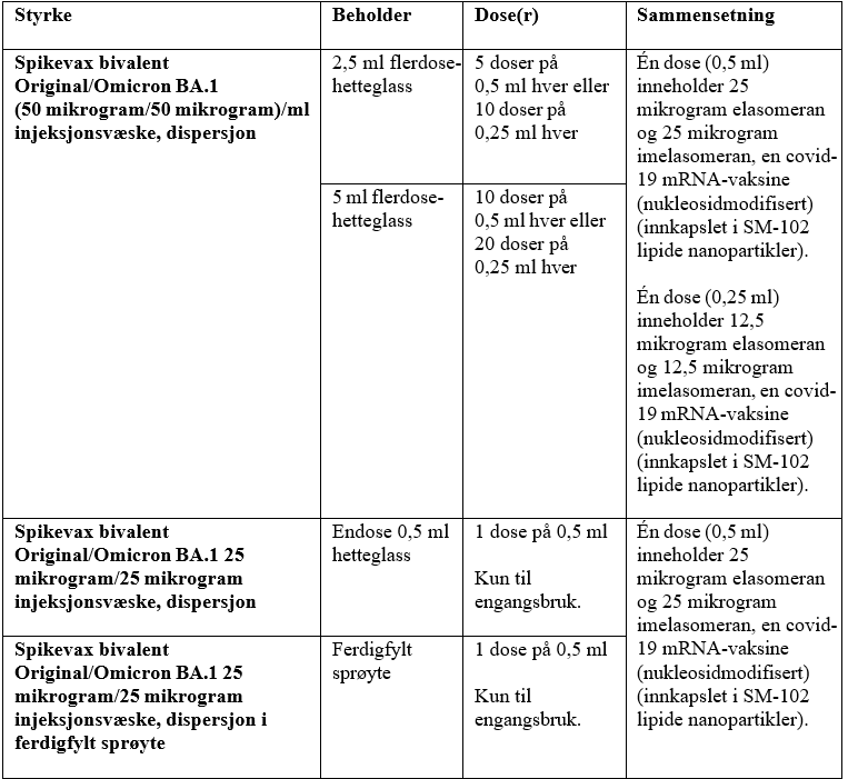 Spikevax bivalent Original/Omicron BA.1 leveres som i en ferdigfylt sprøyte (uten kanyle) med endose, og inneholder 0,5 ml (25 mikrogram elasomeran og 25 mikrogram imelasomeran) mRNA og må tines før administrering.