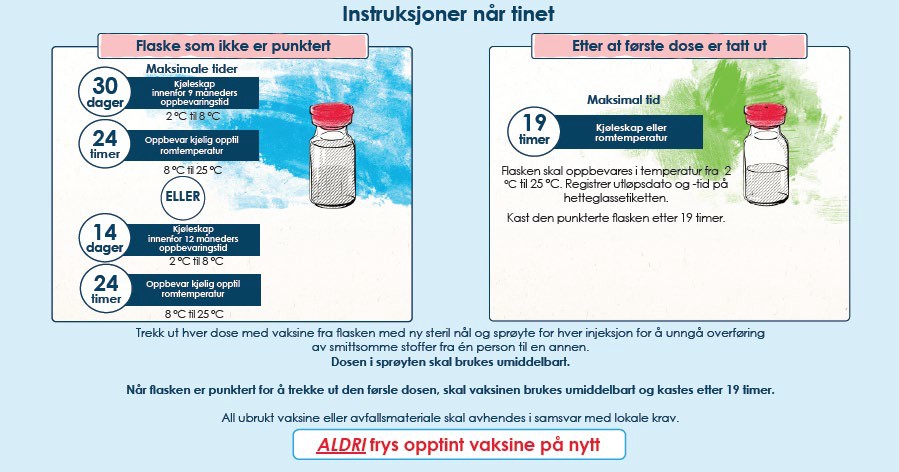 Hver ferdigfylte sprøyte er kun til engangsbruk. Vaksinen er klar til bruk etter opptining.