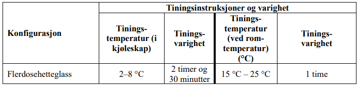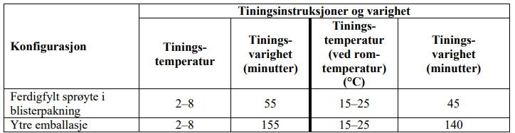 Tabell 5. Tiningsinstruksjoner for ferdigfylte sprøyter og esker før bruk