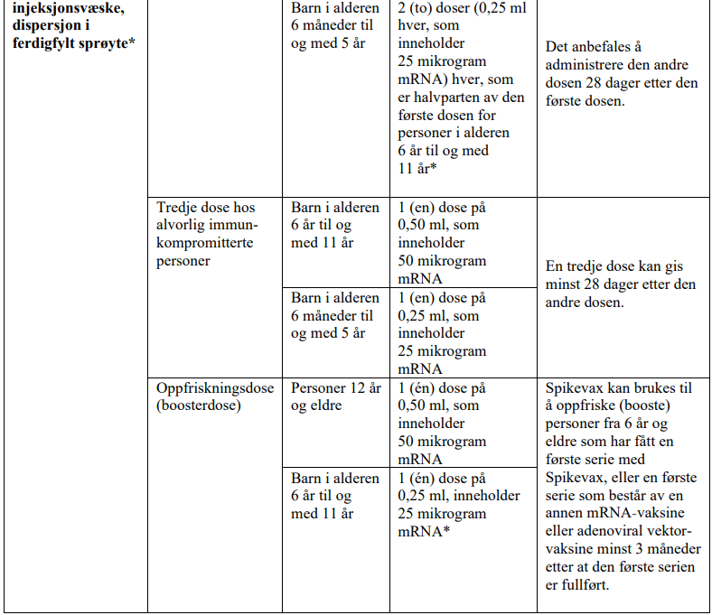 3. Hvordan du bruker SpikevaxTabell 1. Spikevax-dosering i første serie, en tredje dose ved alvorlig immunsvekkelse og oppfriskningsdose (boosterdose)