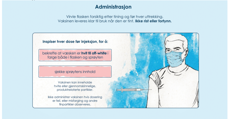 Vaksinene bør inspiseres visuelt for synlige partikler og misfarging før administrering.