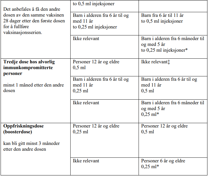 ‡ For den tredje dosen hos alvorlig immunkompromitterte personer i alderen 12 år og eldre, skal hetteglasset med styrke 0,2 mg/ml brukes.