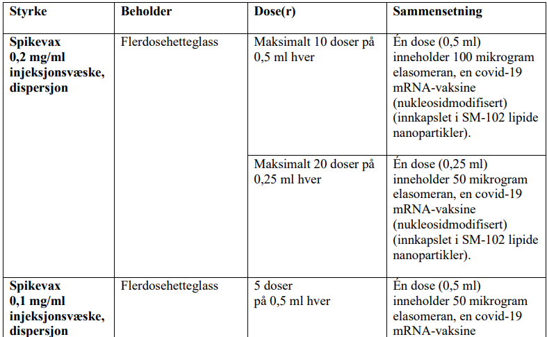 Spikevax er en hvit til off-white dispersjon som leveres i et 2,5 ml hetteglass med gummipropp og et blått vippelokk av plast med aluminiumsforsegling.